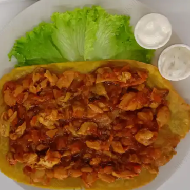Patacón a elegir cubierto de pollo con salsas y acompañante de la casa.