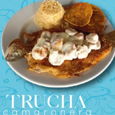 Orden de 300 grs de trucha preparada con camarones, acompañada de arroz con coco, patacón y ensalada del día