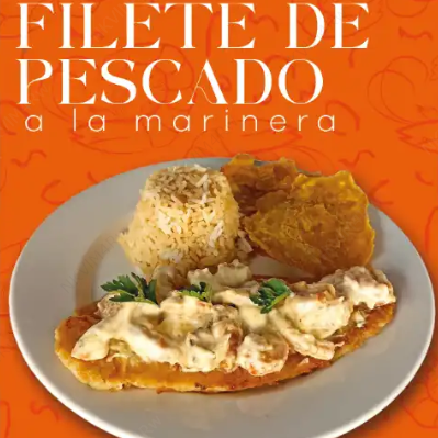 Filete de pescado preparado a la marinera, acompañado de arroz con coco, patacón y ensalada del día