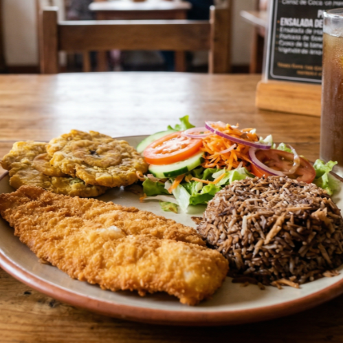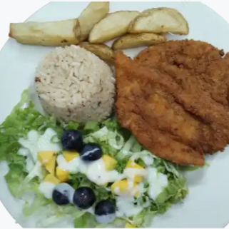 filete de pescado blanco apanado, acompañado de arroz coco o arroz blanco, patacon , ensalada de la casa, sopa del día o consomé de pescado y una limonada natural de panela o jugo del día