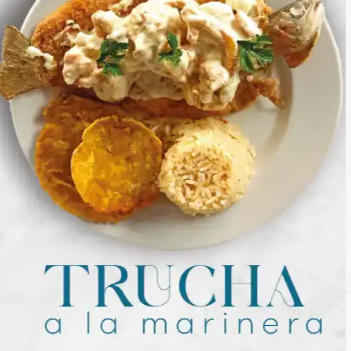 Orden de 300 grs de trucha preparada a la marinera, acompañada de arroz con coco, patacón y ensalada del día