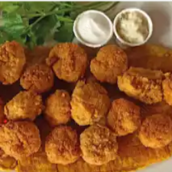 Patacon con camarones apanados, salsa de la casa, suero costeño.