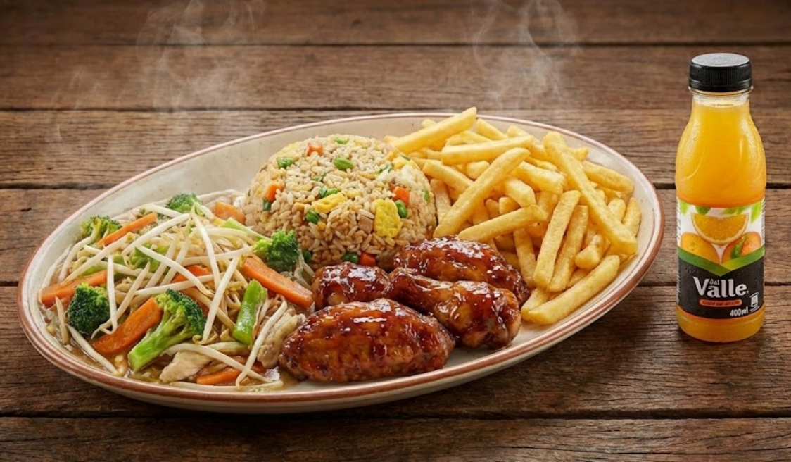 3 alitas BBQ acompañada de arroz, chopsuey, papas francesas, jugo del valle 400ml