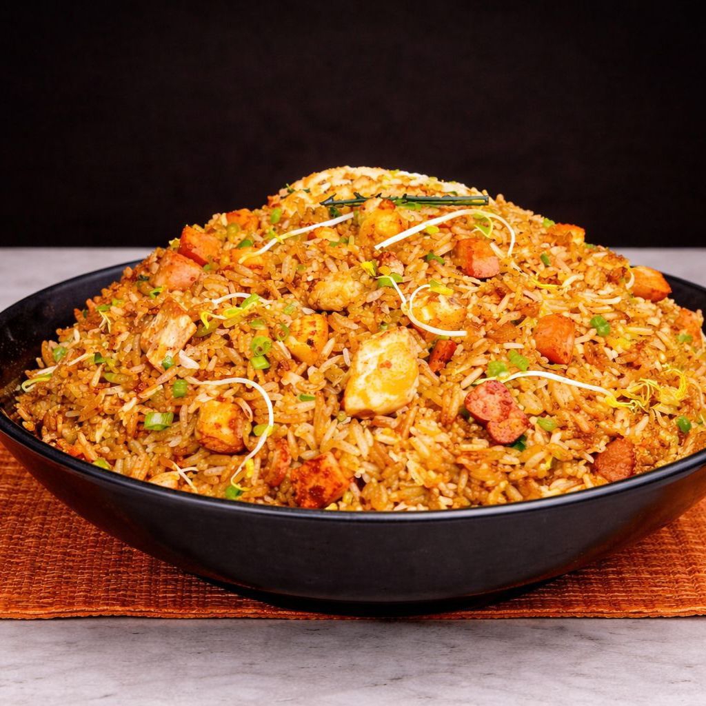 Delicioso arroz chino para 5 personas, pollo, cerdo, costillas ahumada, cebollin, y raíces chinas