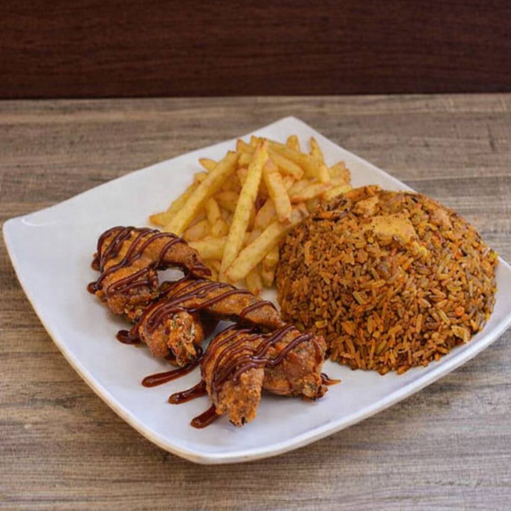 Arroz Premium acompañado de alitas con papas francesas.+ gaseosa+ arroz para 5 personas