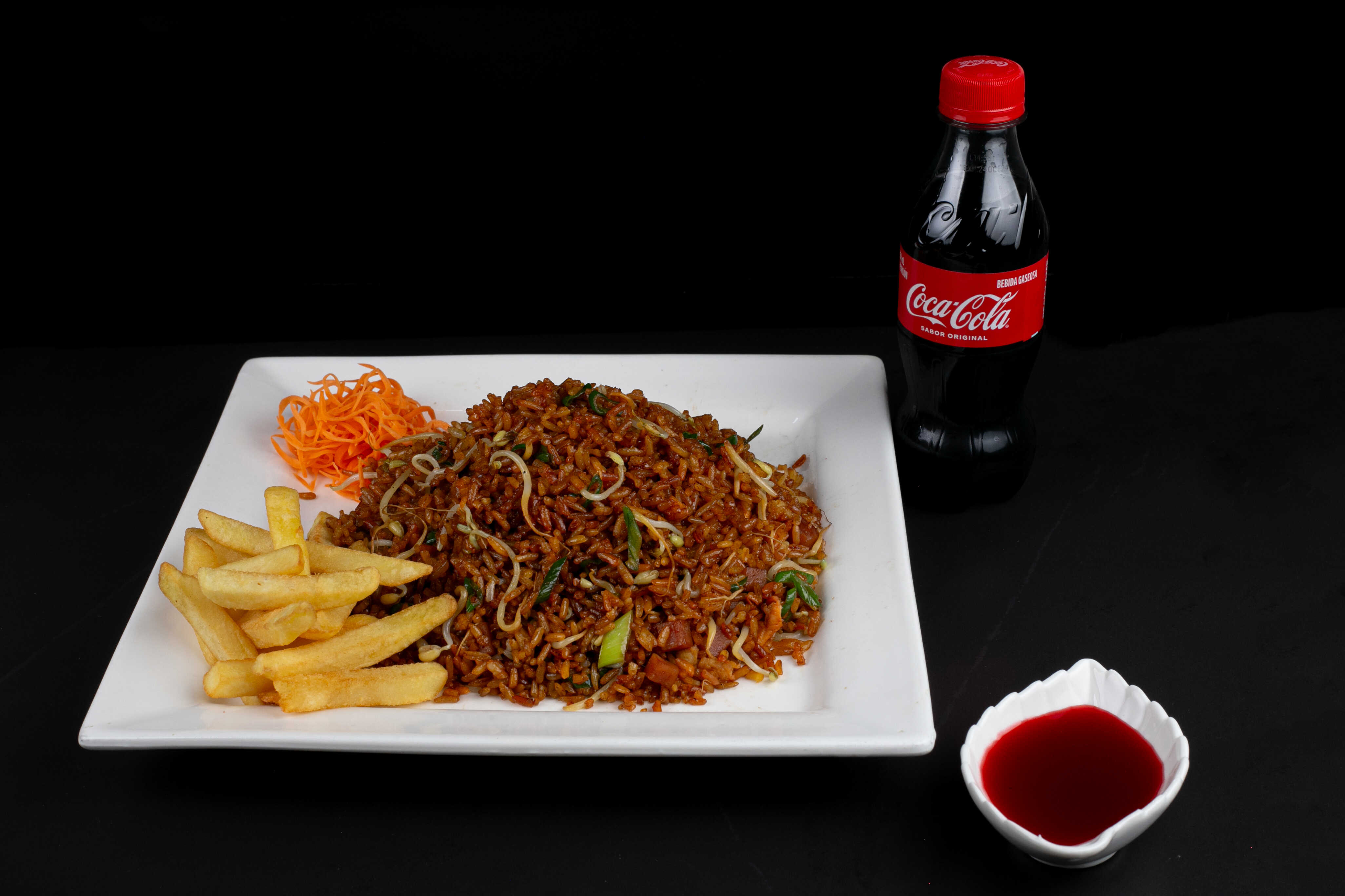 Arroz chino personal (porción de arroz chino con cebollín, raices chinas, jamón ahumado y ajinomoto) + porción de papas a la francesa + Coca Cola 250 ml