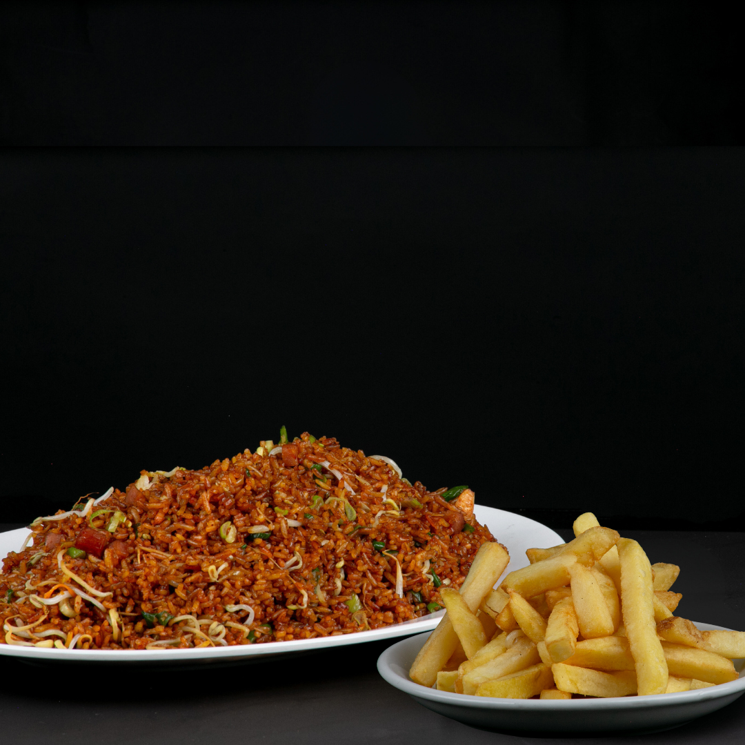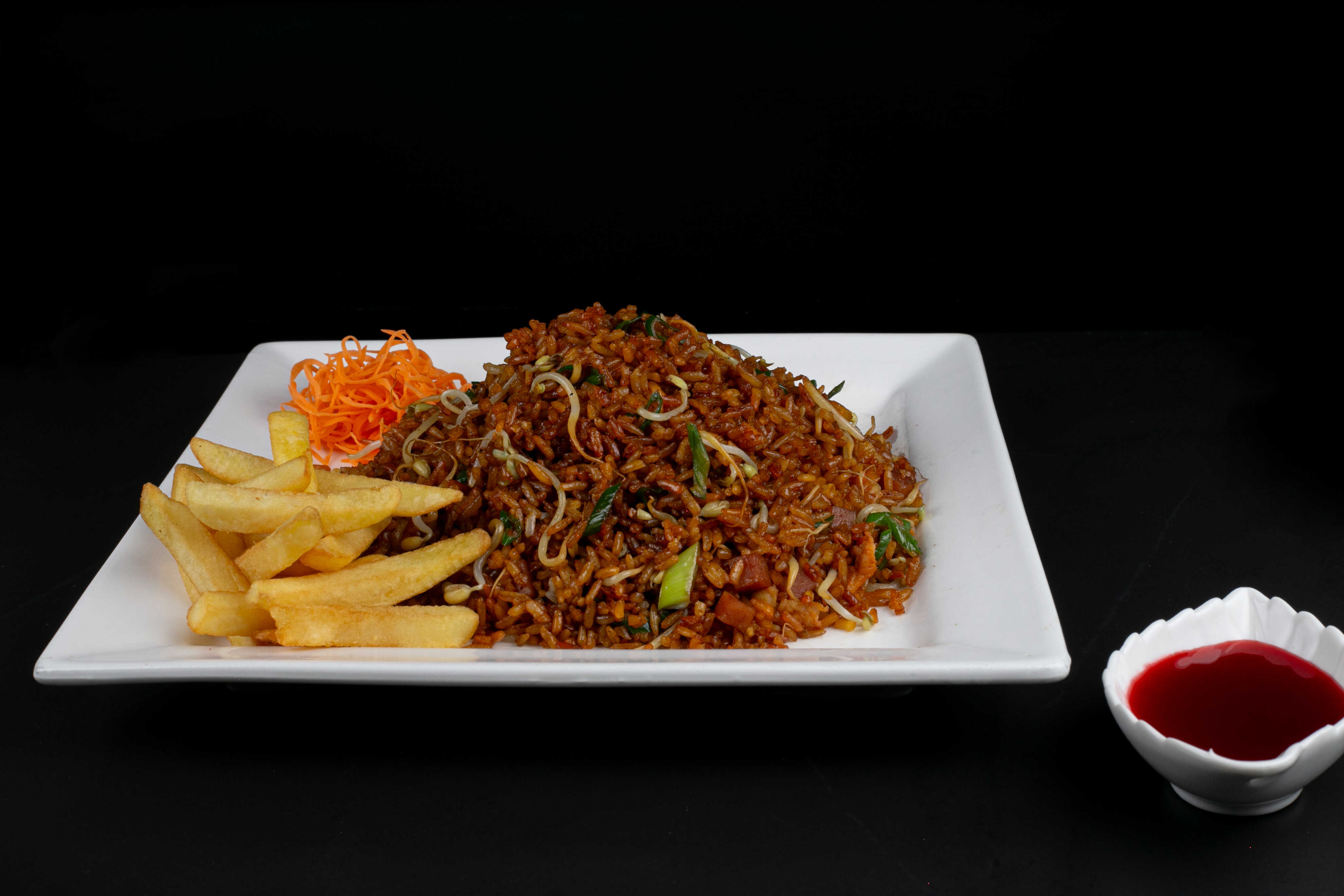 Arroz chino con cebollín, raices chinas, jamón ahumado y ajinomoto) + porción de papas a la francesa