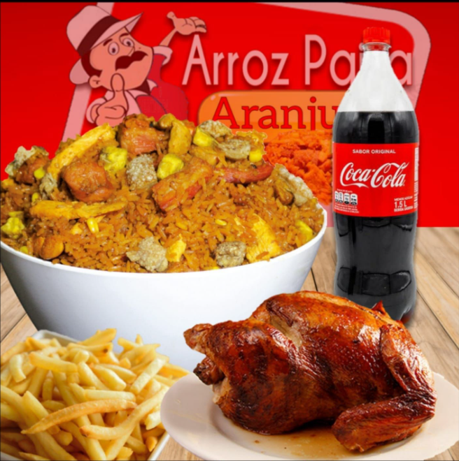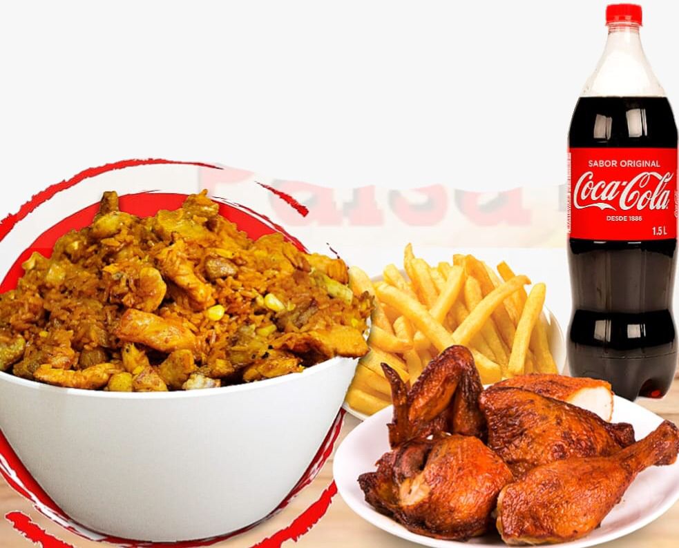 1Kg de arroz acompañado de pollo, pernil de cerdo, chicharrón, plátano maduro y maicitos para 3 personas.