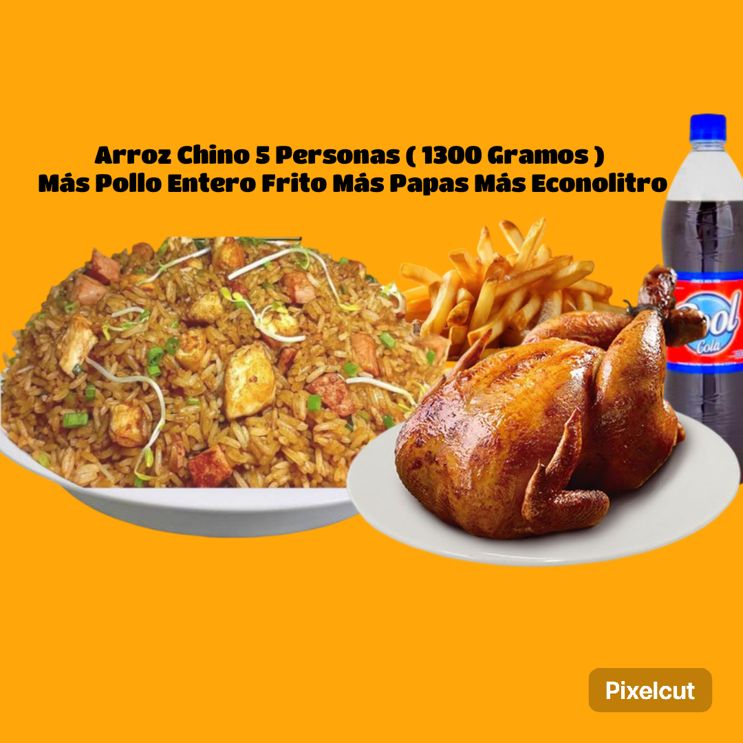Arroz Pollo Cerdo Raíces China Jamón Para 5 Personas Más Un Pollo Entero Frito Acompañado de 200 Gramos de Papas a la francesa Más Una Gaseosa Econolitro