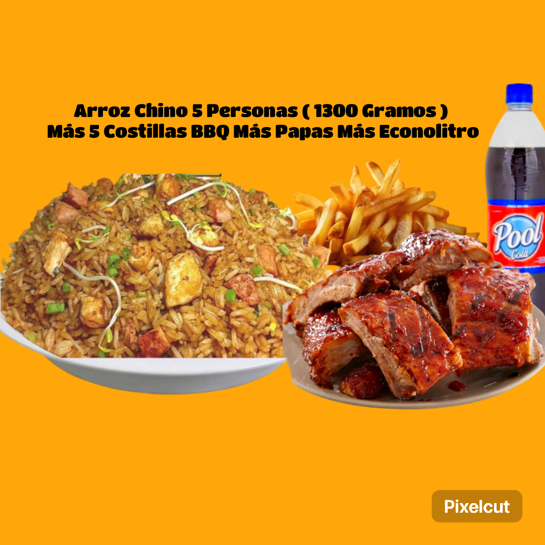 Arroz Pollo Cerdo Raíces China Jamón Para 5 Personas Más 5 Costillas BBQ Acompañado de 200 Gramos de Papas ala francesa Más Gaseosa Econolitro