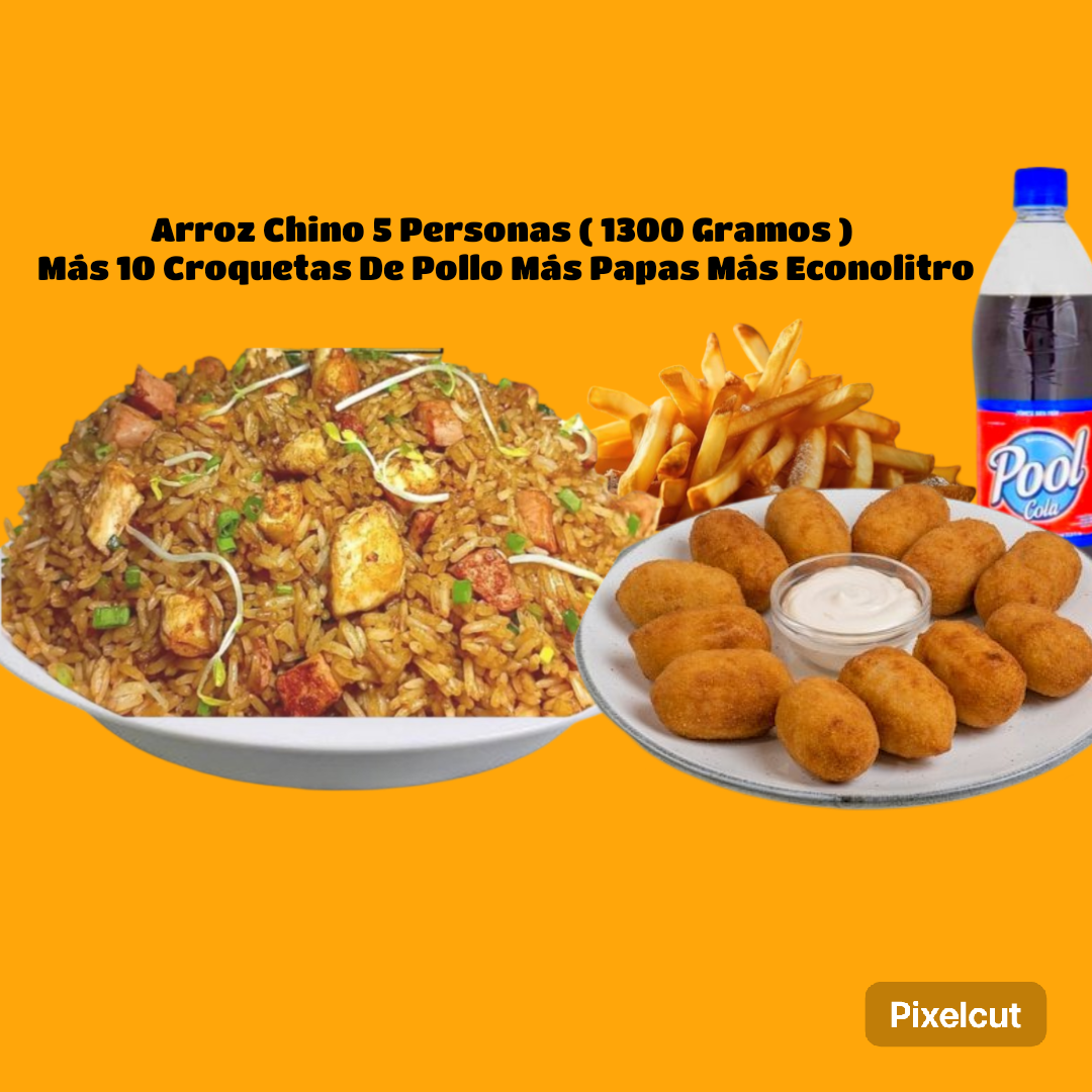 Arroz Pollo Cerdo Raíces China Jamón Para 5 Personas Más 10 Croquetas De Pollo Acompañado de 200 Gramos de Papas ala Francesa Más una Gaseosa Econolitro
