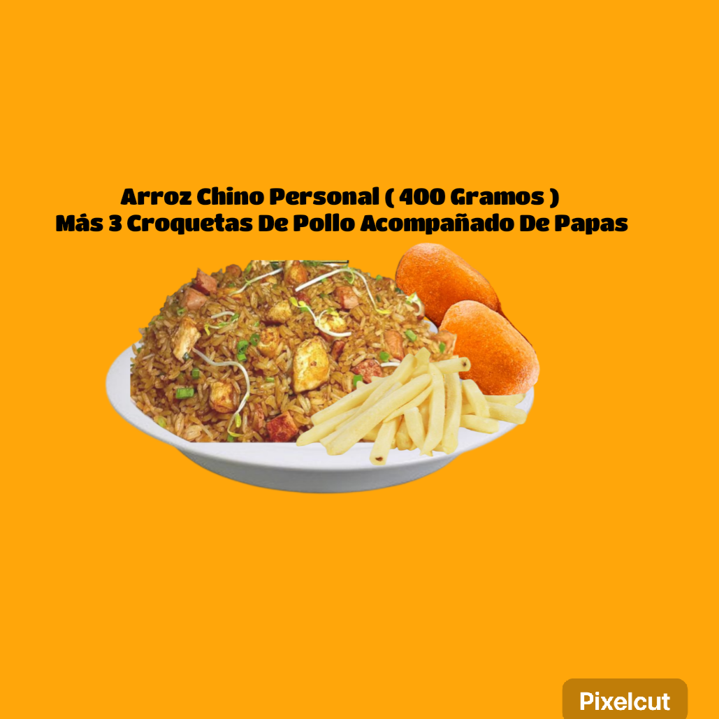 Arroz Pollo Cerdo Raíces China Jamón Para Una Sola Persona ( 400 Gramos ) Más 3 Croquetas de Pollo Más Papas ala francesa