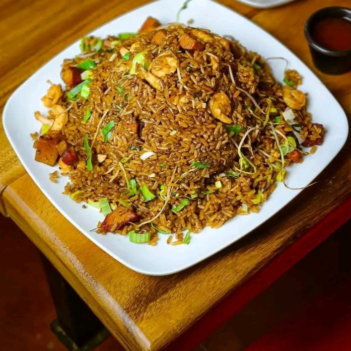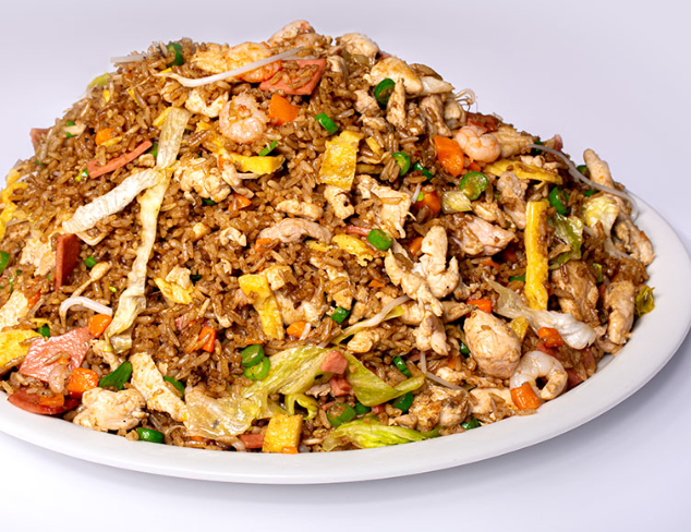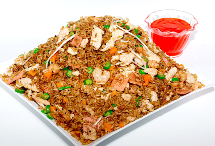 Arroz chino de 800 gramos aprox, Este es un platillo para dos personas, el cual incluye: jamón en trozos ,cerdo en trozos, carne de res en trozos, pollo en trozos ,cebollín, arroz, raíz china, salsa agridulce.