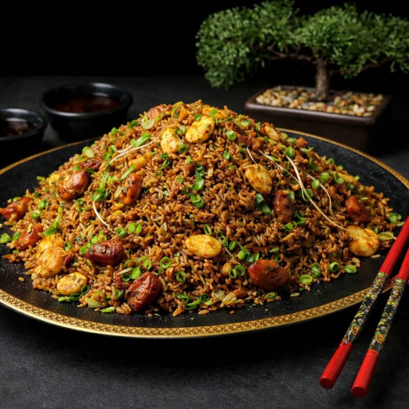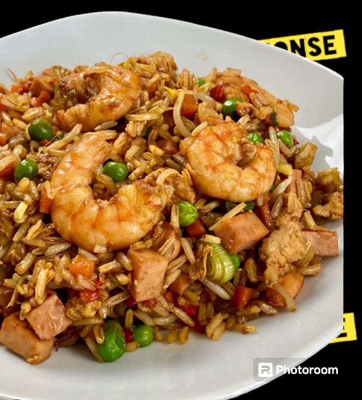 Arroz chino de 800 g aprox, preparado con camarones, jamón, cerdo, pollo, cebollín, raíces chinas y salsa agridulce.