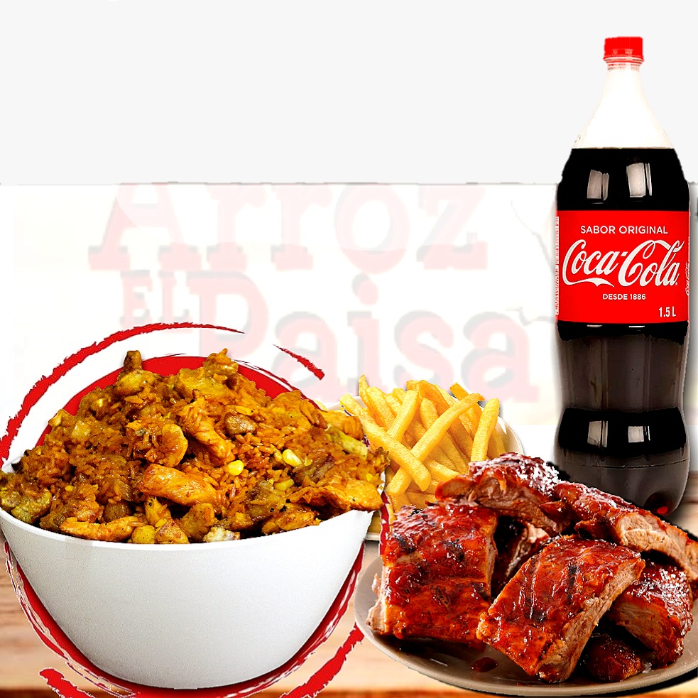 Arroz paisa (pollo, pernil de cerdo, chicharrón, plátano maduro, maicitos) Acompañado de 5 costillas BBQ, más papas a la francesa y Gaseosa 1.5 Lts