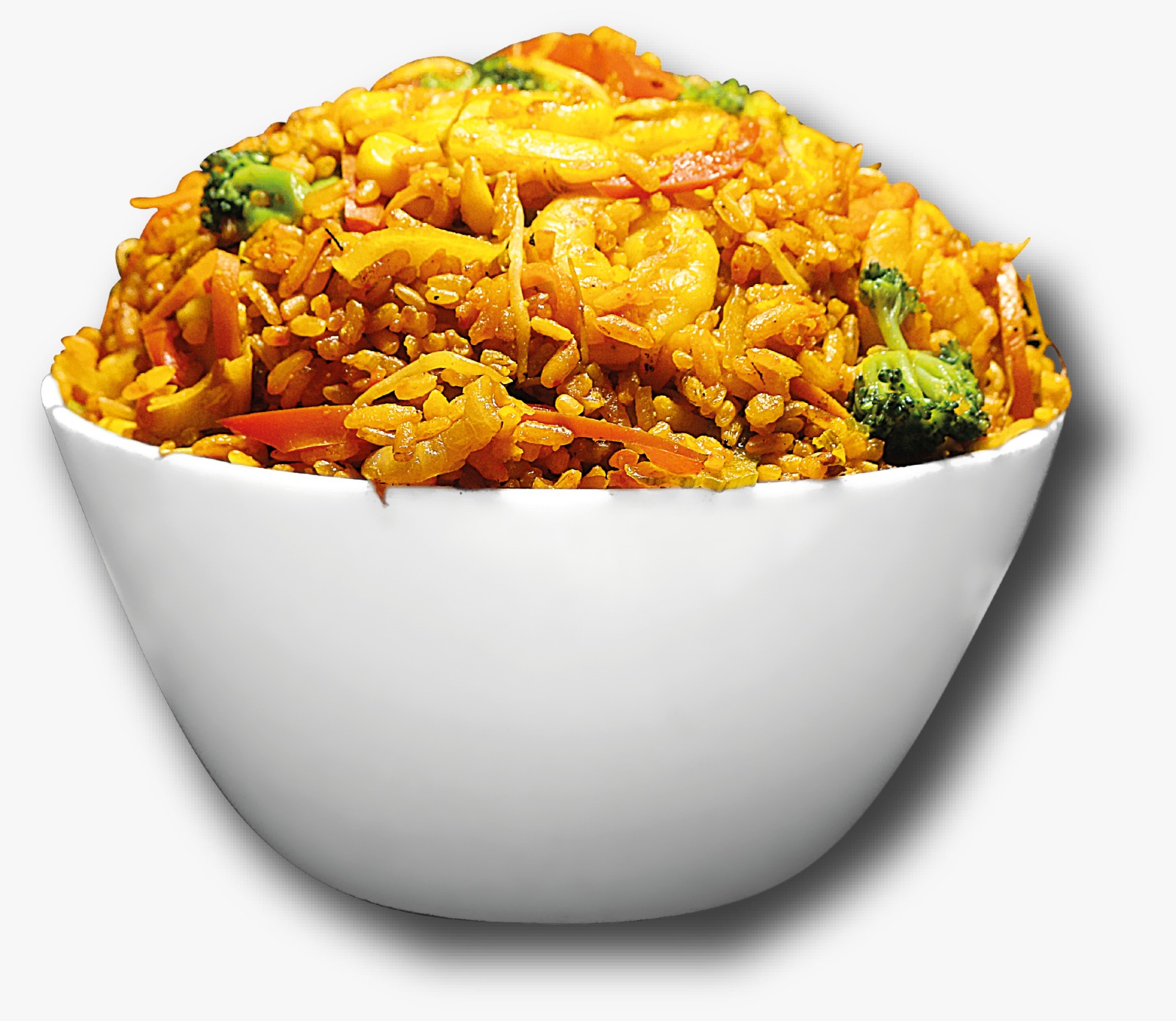 Arroz, Cerdo, Pollo, Raíz china, Jamón, Cebollín, Soya, Especias Chinas; (empacado en un porta comida de 21x15cm)