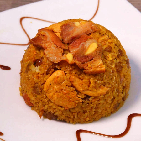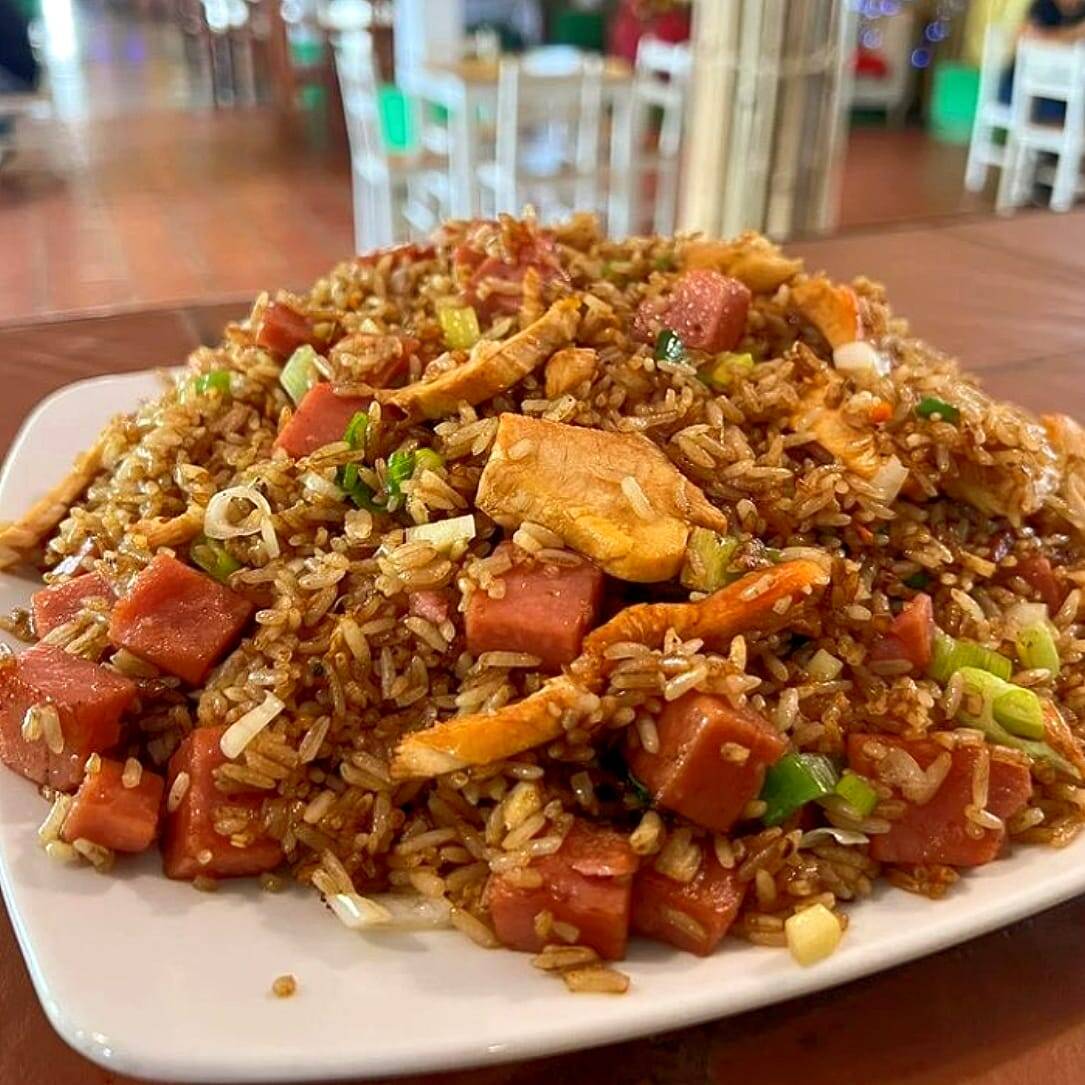 Arroz, Cerdo, Pollo, Raiz china, Jamon, Cebollin, Soya, Especias Chinas