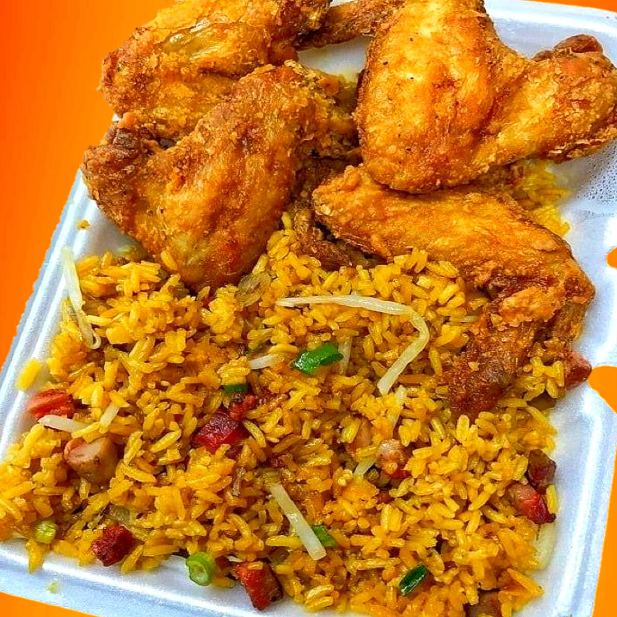 Arroz paisa (pollo, pernil de cerdo, chicharrón, plátano maduro, maicitos) o arroz ranchero (cerdo, costilla, pollo, chorizo, maicito) más papas a la francesa o chop suey.