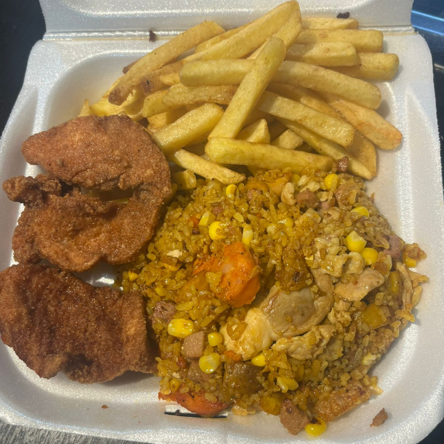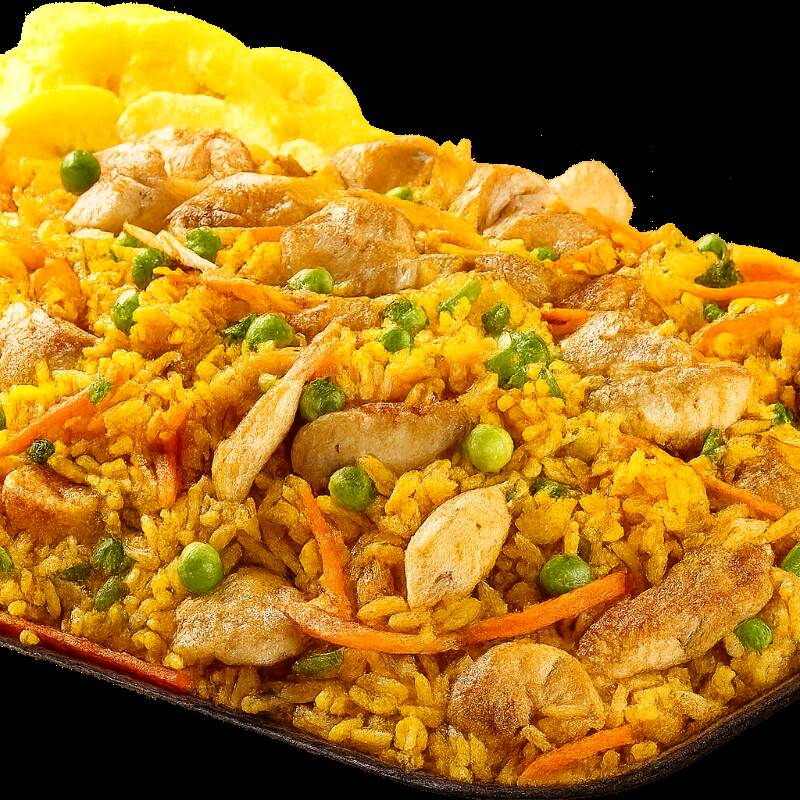 Rico arroz con pollo, pernil de cerdo, chicharron, platano maduro y maicitos 2.300G