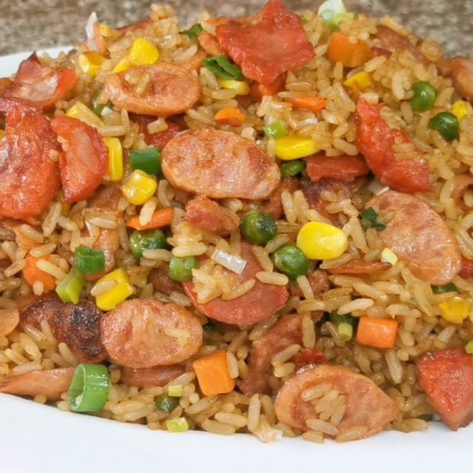 ARROZ CHINO: Delicioso arroz preparado con pollo, jamón, cerdo, raíz china, cebollín, salsa soya 1200G