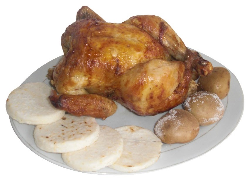 Un pollo entero brosty acompañado de 4 Papas y 4 arepas.