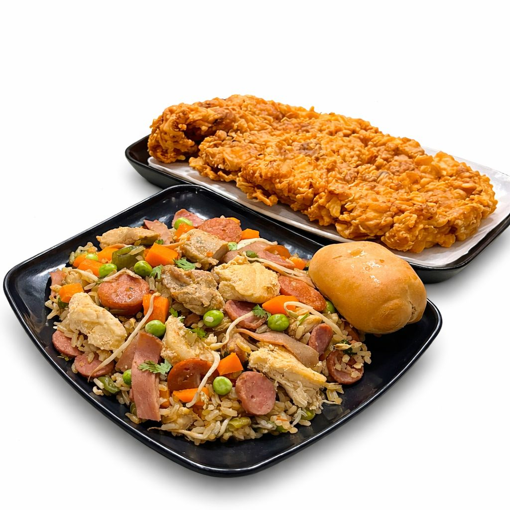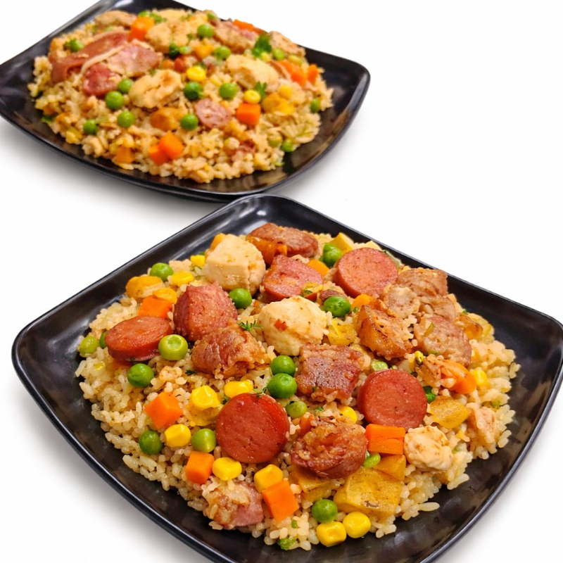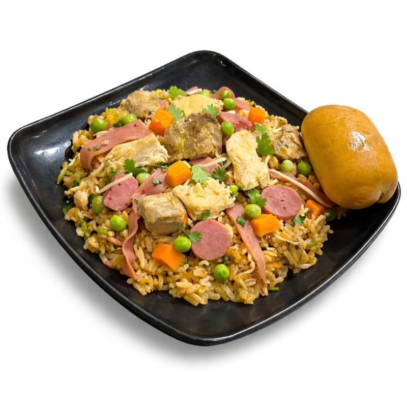 Arroz al wok con chicharrón, chorizo, pechuga de pollo, trocitos de plátano maduro, maicitos y mix de verduras, con 4 panes.