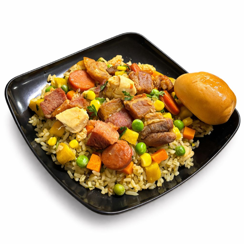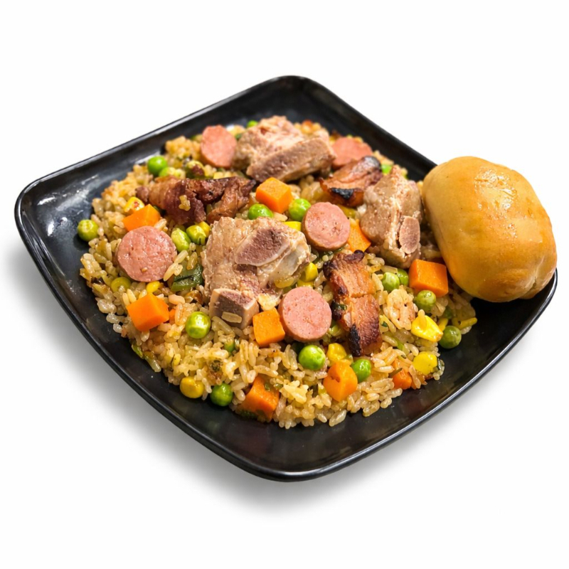 Arroz al wok con costillas de cerdo, tocineta, salchicha, maicitos, mix de verduras y 1 pan.