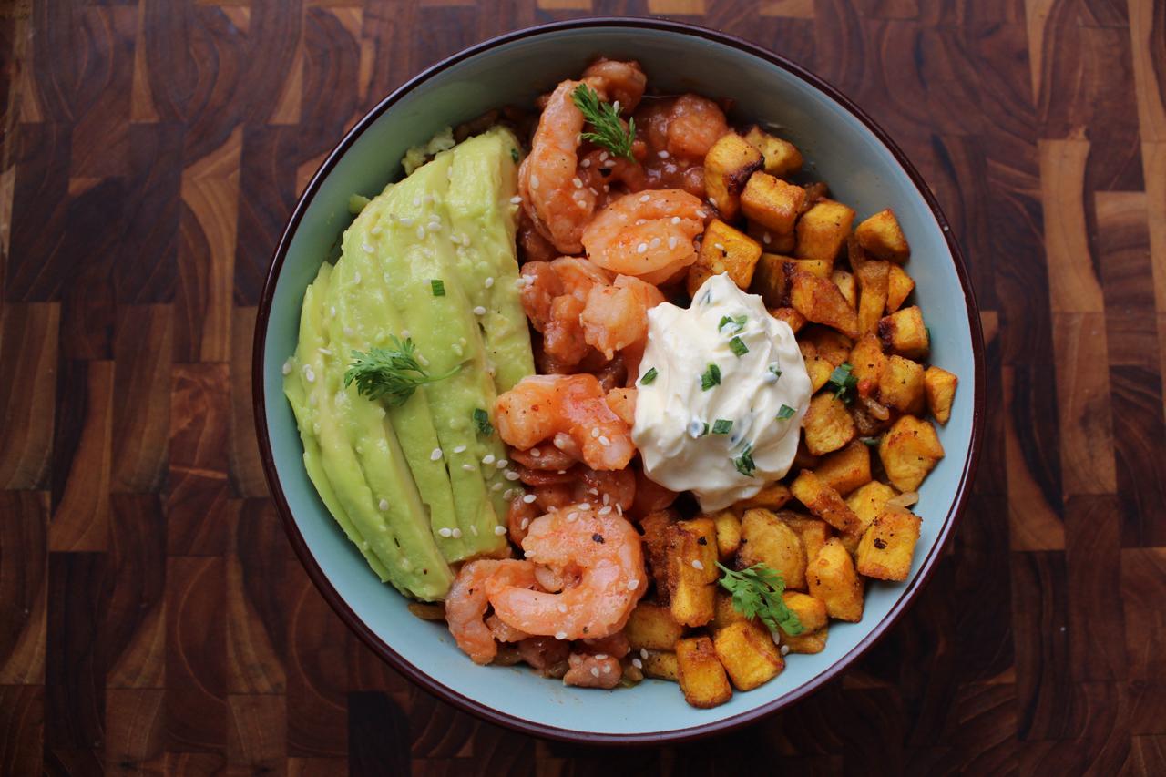 Base de arroz salteado, patacones o platanitos maduros asados, camarón en salsa de la casa, aguacate, topping de semillas de sesamo y aderezo cremoso de la casa.