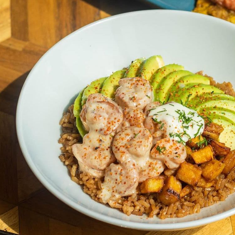 Base de arroz salteado, platano maduro asado, camarón en salsa cremosa de la casa, aguacate, topping de semillas de sesamo y aderezo de la casa.