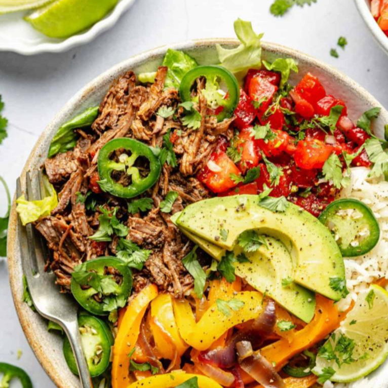 Base de arroz, pechuga de pollo, pico de gallo con cilantro, maduritos, aguacate ó cremoso de aguacate de la casa y un toque de queso crema.