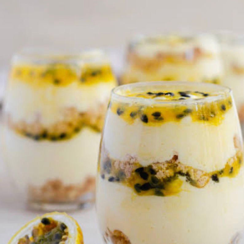 Postre cuchareable de maracuya con capas de galleta, y crema especial con pulpa fresca de maracuya , ademas de un coulis(espejo) de su fruta