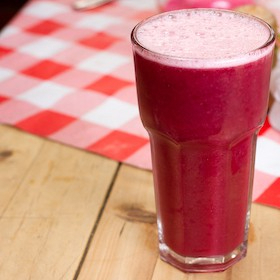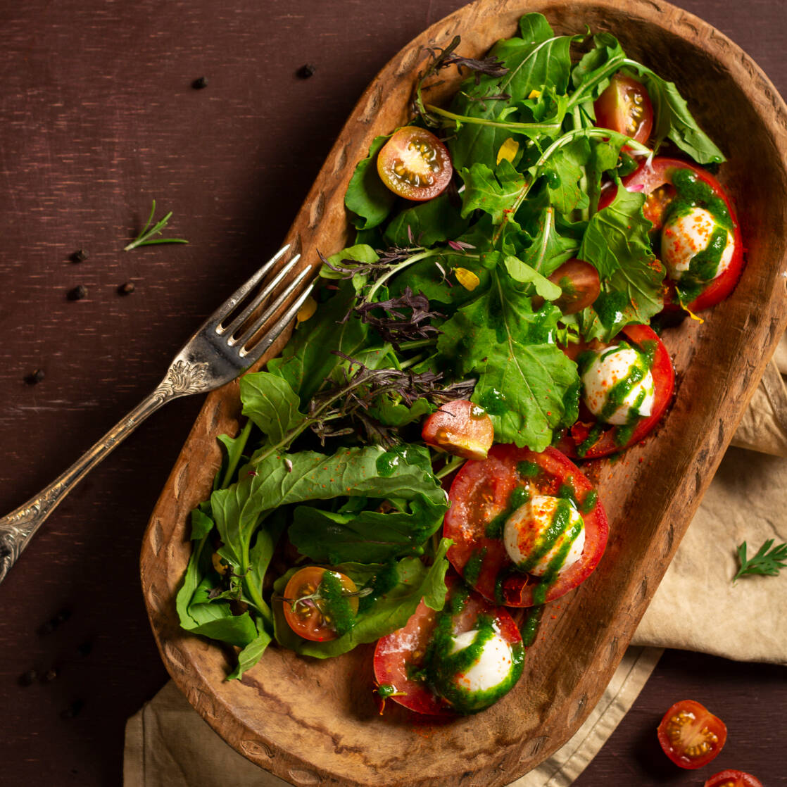 Fresca ensalada con base de tomate fresco, pesto de albahaca, queso bococcine de búfala y rúgula.
