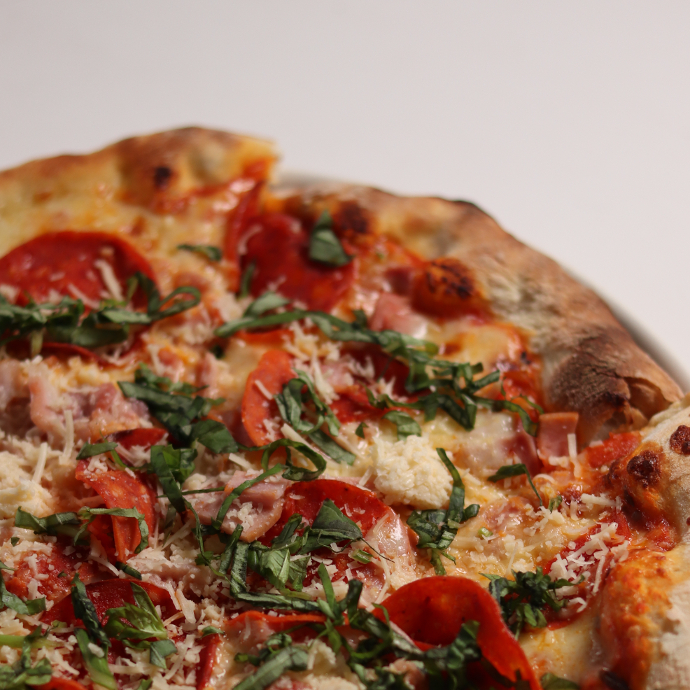 Base pomodoro, queso mozarella, peperoni, tocineta, salami y queso parmesano.