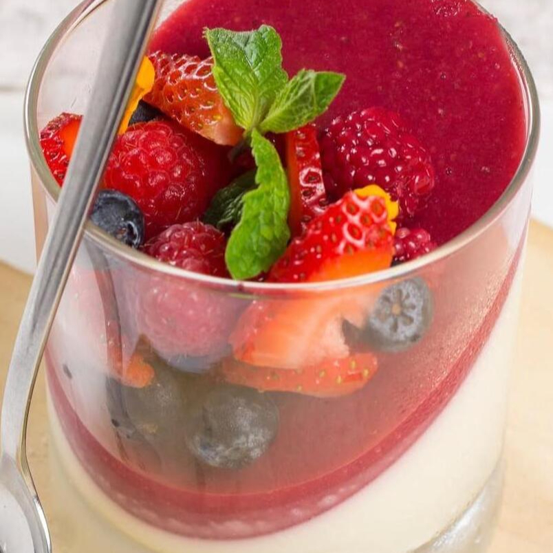 Cremosa pannacotta artesanal aromatizada con romero fresco, servida con una mezcla de frutos rojos