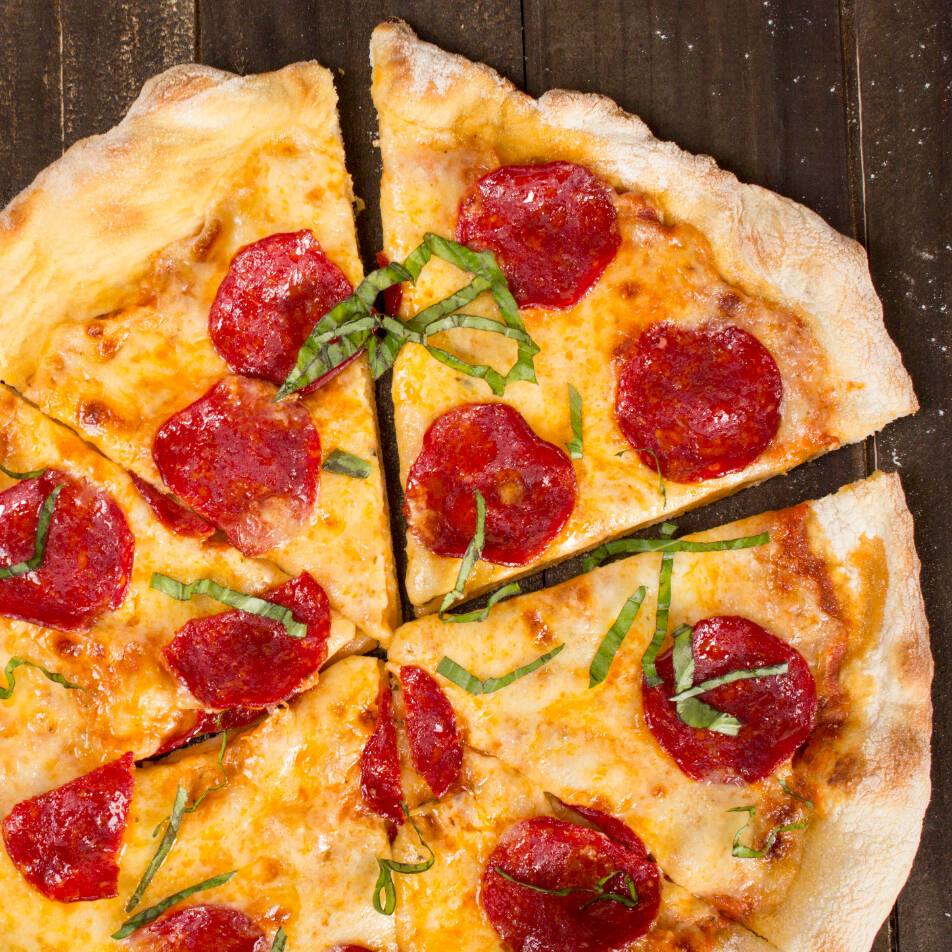 Base pomodoro, queso mozarella, cebolla caramelizada, peperoni, queso philadelphia y reducción balsamica.