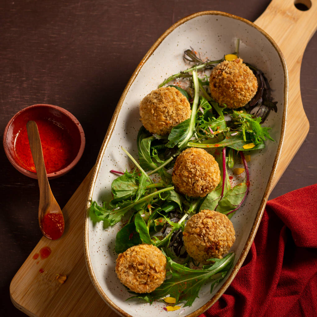 Croquetas de lentejas previamente germinadas, acompañadas con emulsión de pimientos asados.
