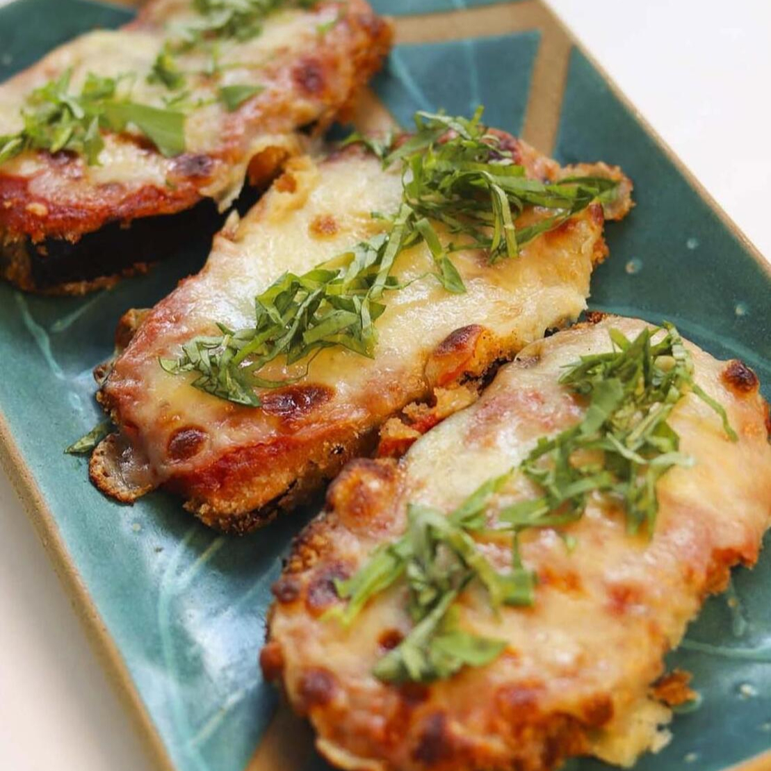 Rebanadas crocantes de berenjenas apanadas con parmesano, gratinados con salsa pomodoro y queso mozarella.
