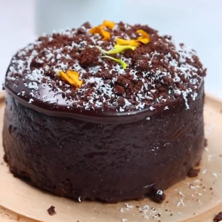 Esponjosa torta de chocolate, rellena y cubierta con ganache de chocolate semiamargo.
