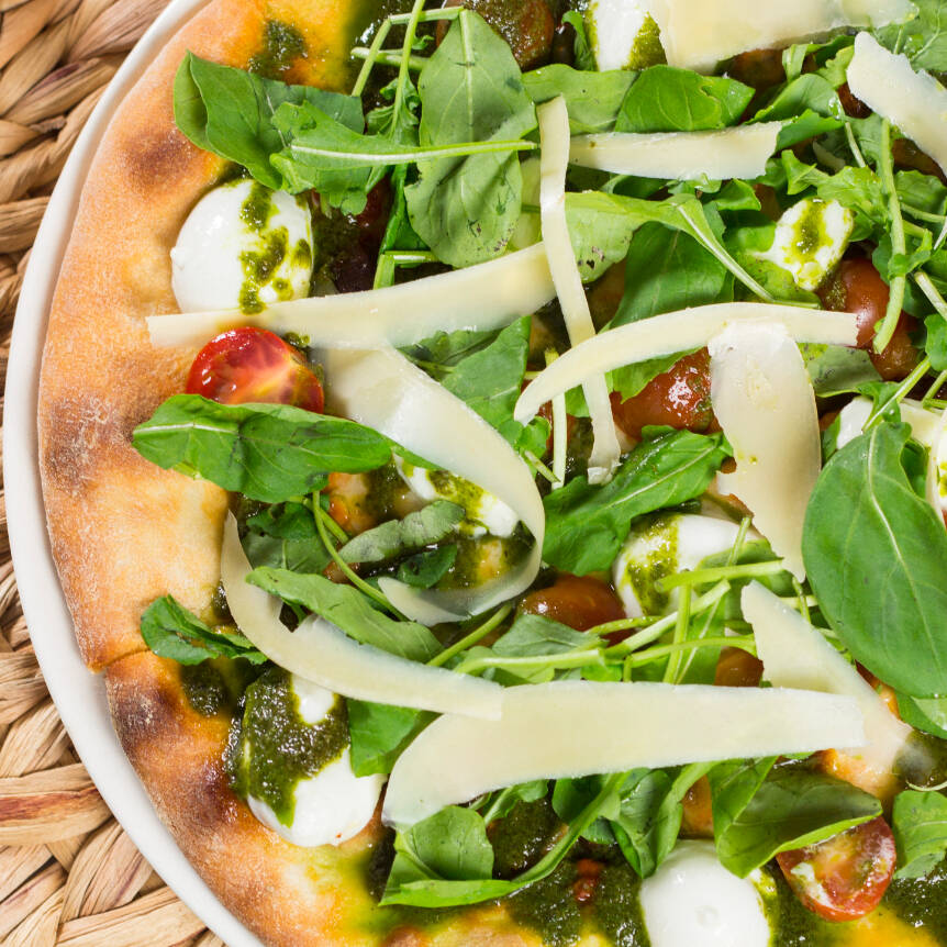 Base pomodoro, queso mozarella, queso de búfala, tomate cherry confitado, pesto de albahaca, rúgula y queso parmesano