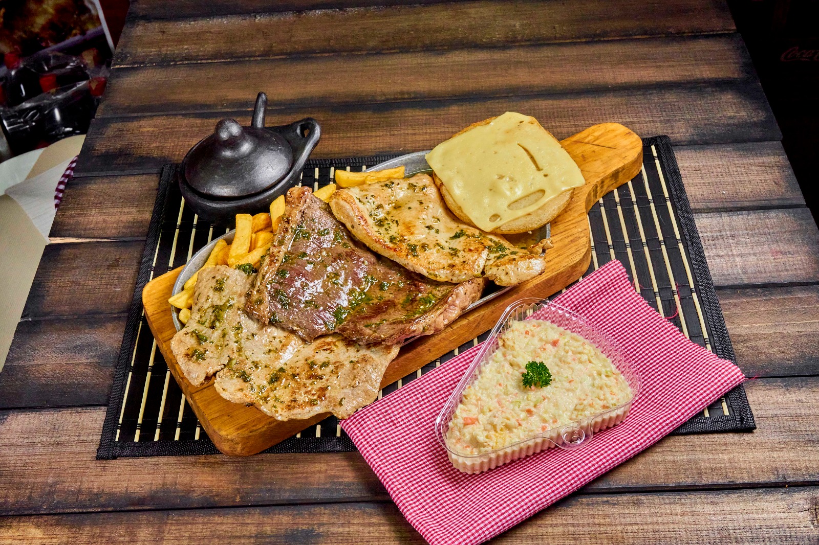 Corte de cerdo, corte de res, corte de pollo, acompañado de papas fritas, arepa con queso y ensalada de la casa.
