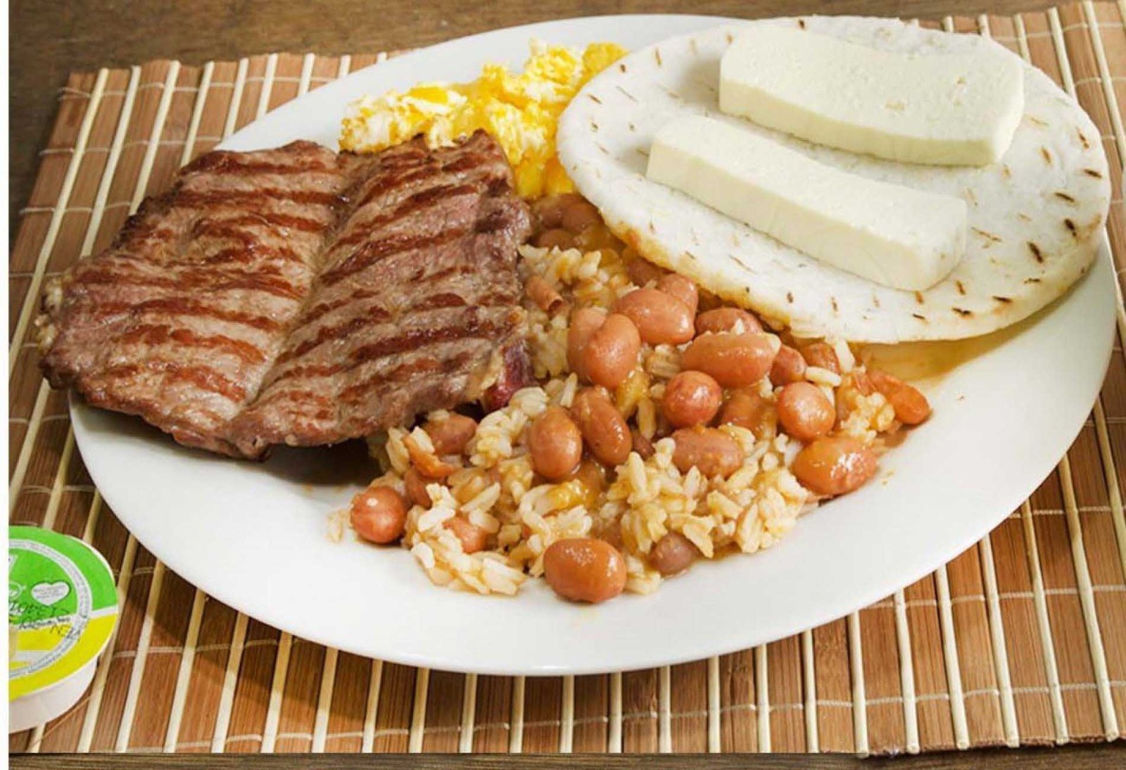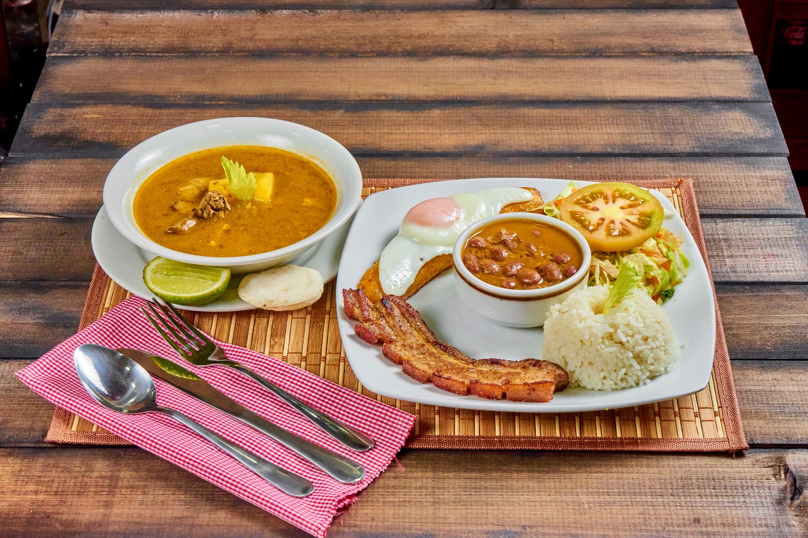 Frijoles, ensalada del día, aguacate, maduro, arroz, huevo frito, carne molida, chorizo, morcilla, chicharrón, carne de cerdo.