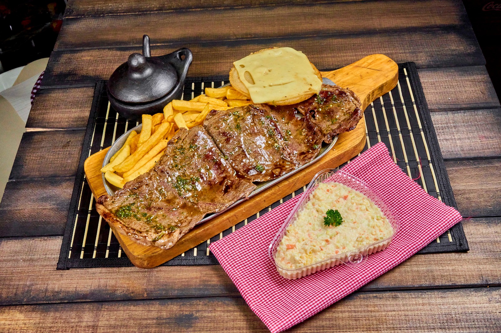 Churrasco acompañado de papas fritas, arepa con queso y ensalada de la casa.