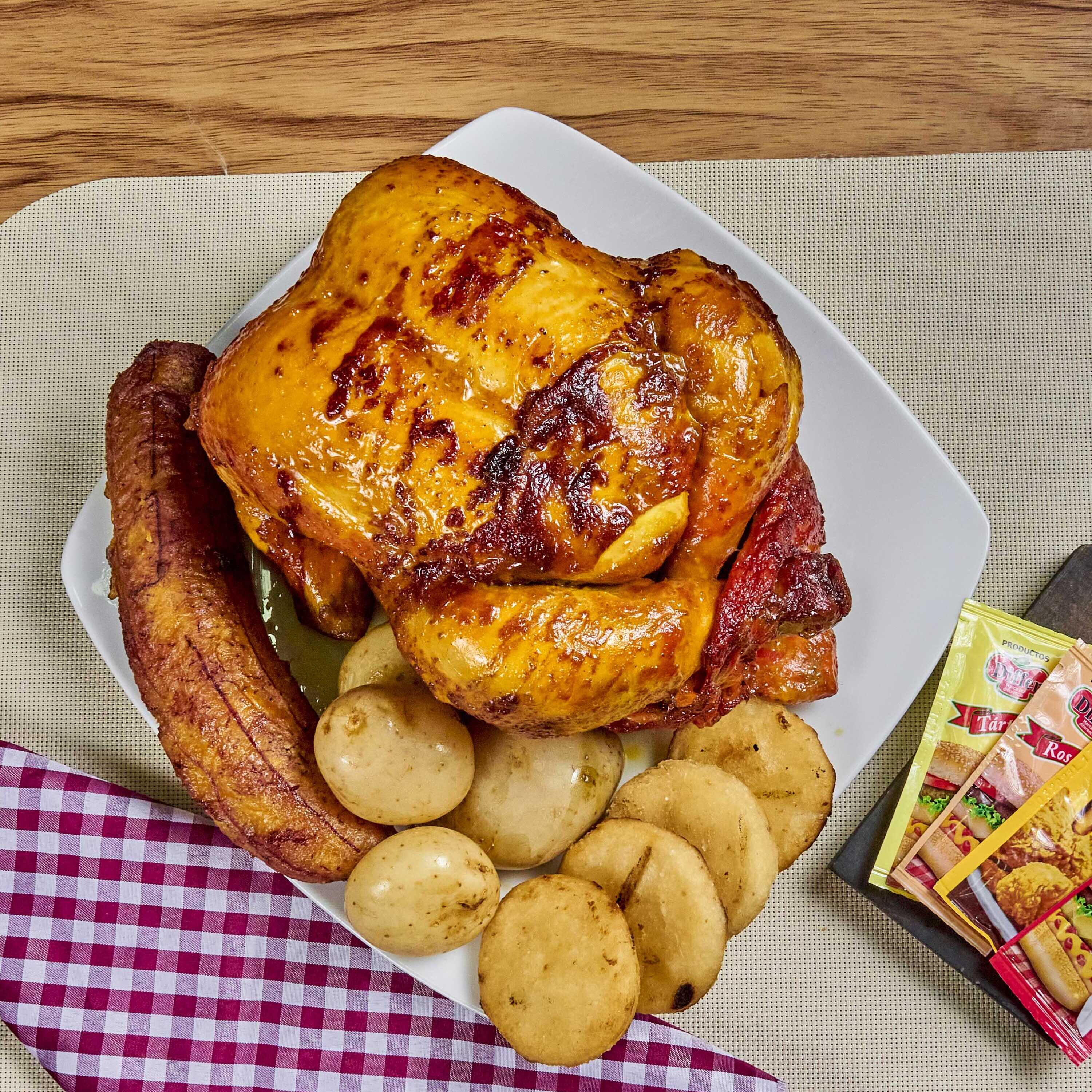 4 Presas de pollo, acompañado de 2 arepas y 2 papas cocinadas.
