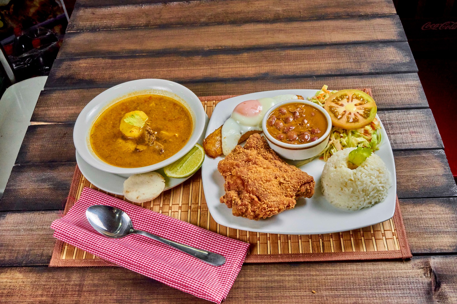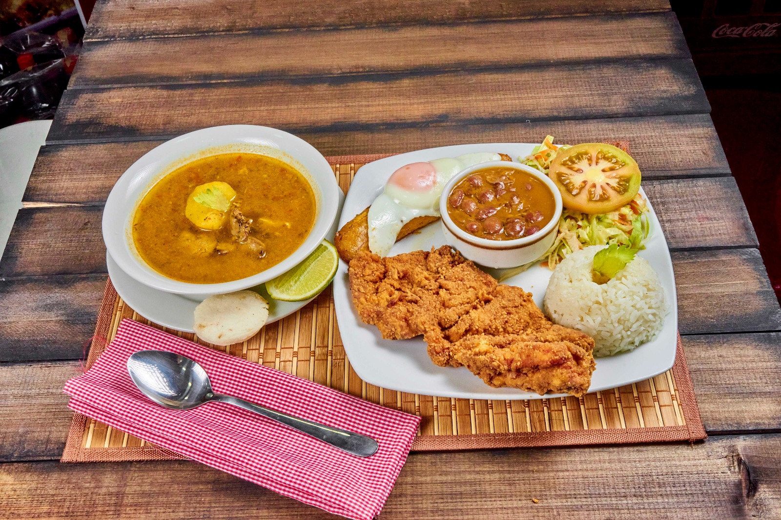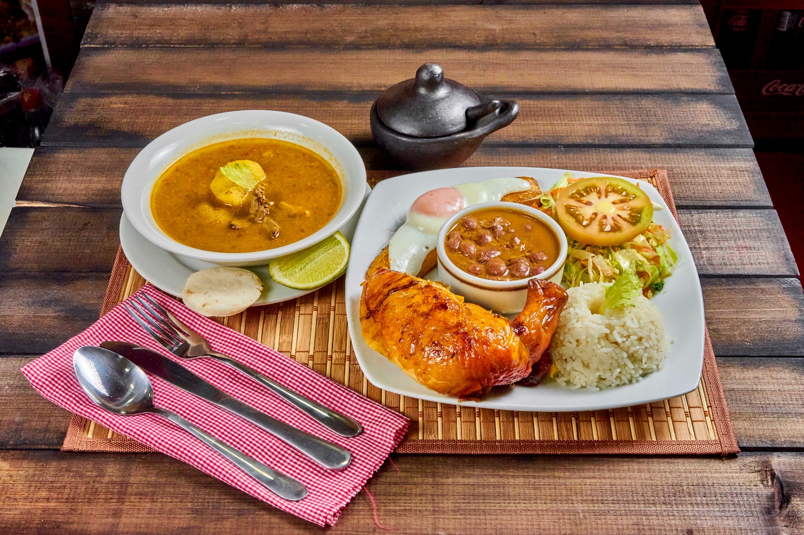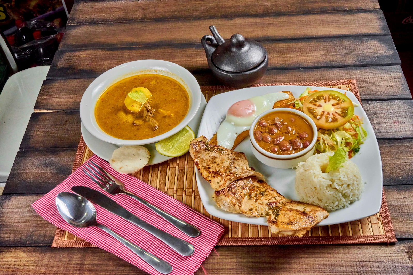 Arroz, frijoles, maduro, huevo, ensalada de la casa, sopa del día, jugo del día y una presa de pollo apanada.