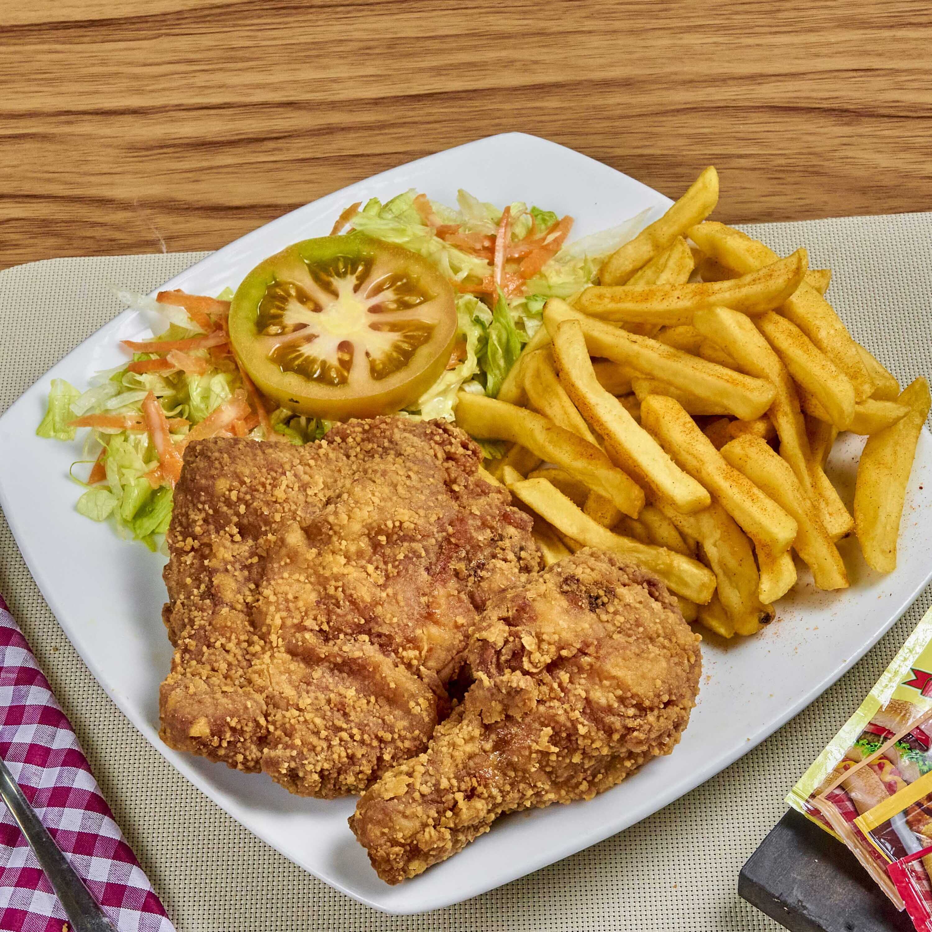 Dos presas de pollo, pechuga y ala de pollo apanada, acompañados de papas a la francesa y ensalada de la casa.