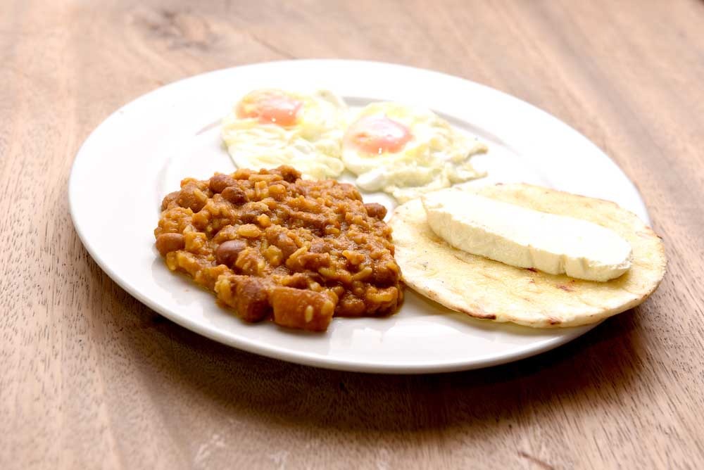 Frijoles con arroz, chorizo, huevos con aliños, arepa con quesito.