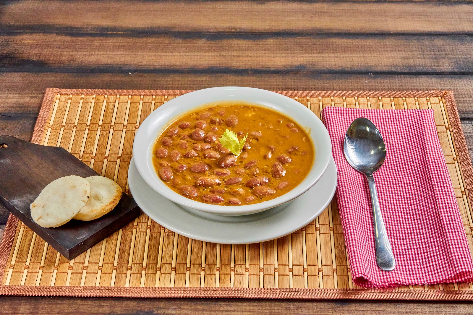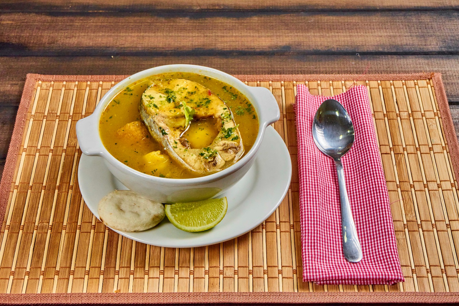 Caldo, acompañado de carne de res, mazorca, papa, yuca, plátano, ensalada de la casa, arroz blanco y aguacate.