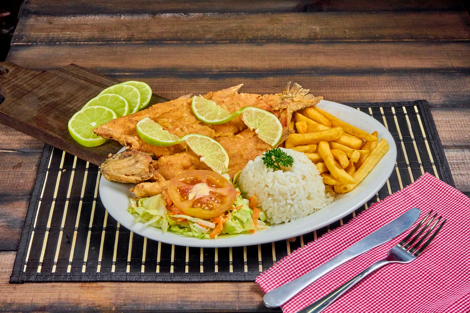 Tilapia frita, papas a la francesa, ensalada de la casa y arroz.