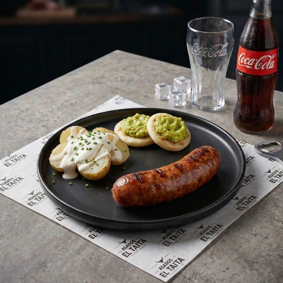 Chorizo acompañado de Papas al vapor con sour cream, arepas con guacamole y mazorca dulce y gaseosa 250 ml