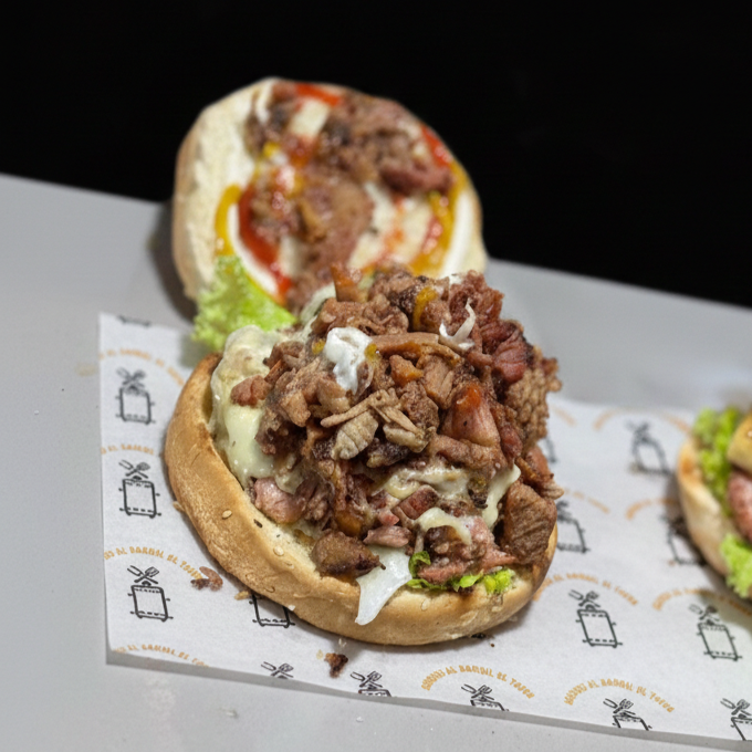 Arepa rellena de chicharrón, bondiola, tocineta, guacamole, hogao, queso mozzarella.